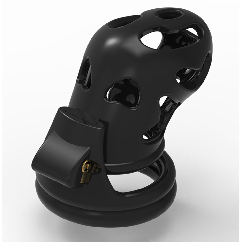💡 En bref : cage de chasteté homme | polycarbonate rigide noir | 4 anneaux ajustables | cage coudée ergonomique | nombreuses ouvertures | verrou intégré