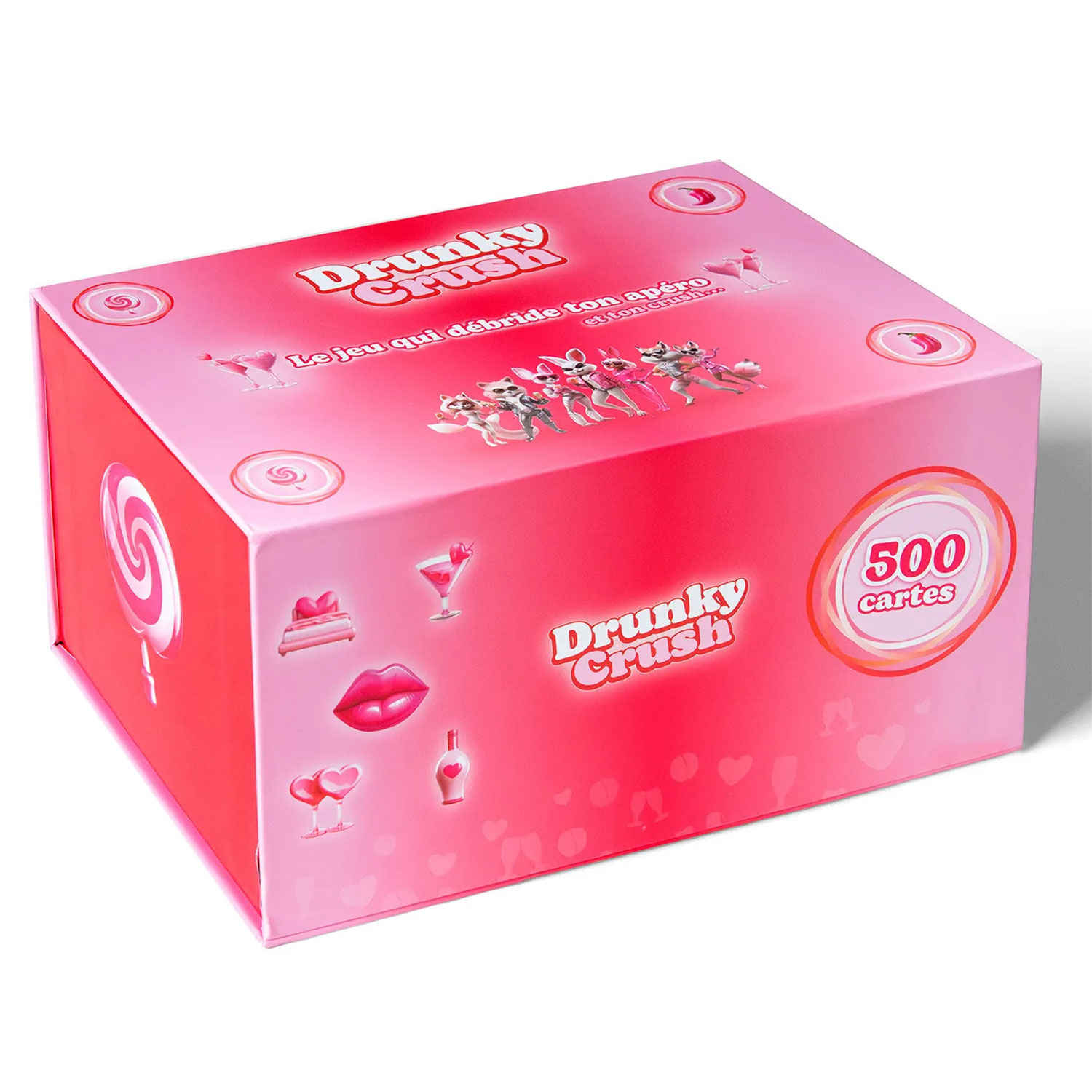 500 cartes (250 cartes pour une partie “Crushy” conçue pour stimuler la complicité et les échanges et 250 cartes pour une partie “Spicy” qui vise à réveiller le désir)