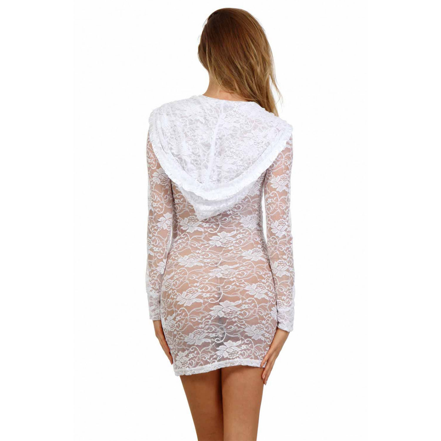 La dentelle est douce, légère et légèrement extensible : elle se pose sur la peau sans jamais gratter et laisse deviner les formes avec juste ce qu’il faut de transparence. La capuche et les manches longues créent un contraste parfait entre l’allure innocente et l’intention clairement sensuelle. Le zip double sens, placé au centre devant, permet d’ouvrir la robe exactement comme on le souhaite : un peu par le haut, un peu par le bas, ou les deux en même temps. Les deux poches plaquées, bordées de ruban et légèrement froncées, ajoutent une touche féminine et pratique.