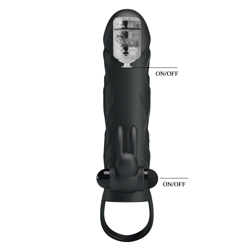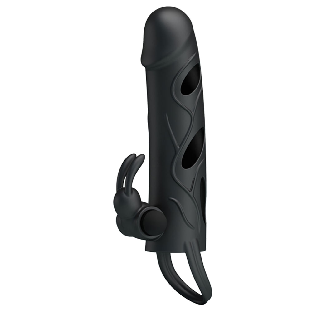 Gaine pénis vibrante Pretty Love avec stimulateur clitoridien lapin, double moteur et silicone ajouré extensible pour une stimulation interne et externe coordonnée.