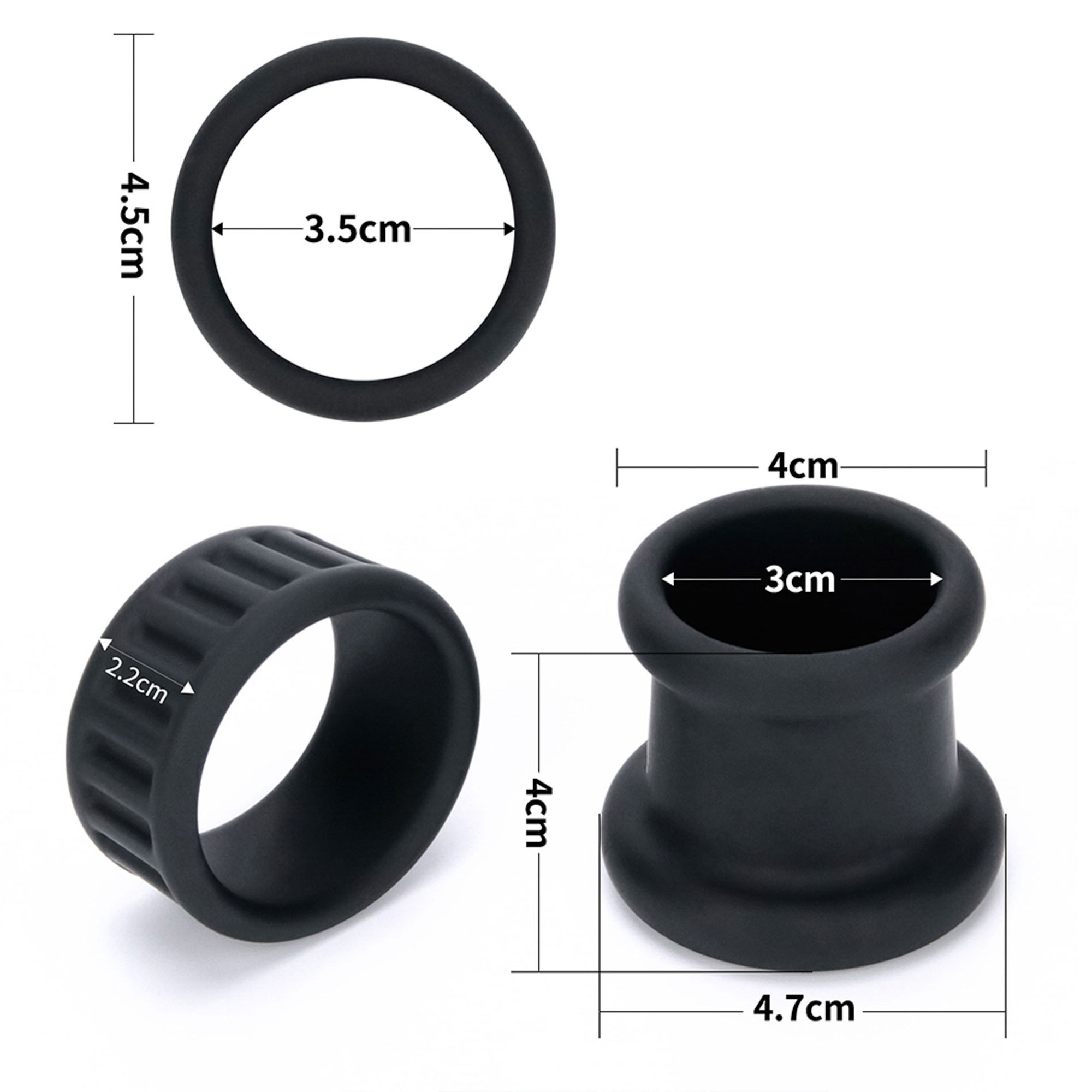 Les deux anneaux superposés → constriction à la base du pénis + traction sur les testicules. Effet : érection maximale + sensation de « paquet poussé en avant », volume visuel impressionnant, plaisir amplifié pour les deux partenaires. - Ballstretcher + cockring inversés (ballstretcher en haut, cockring en bas)